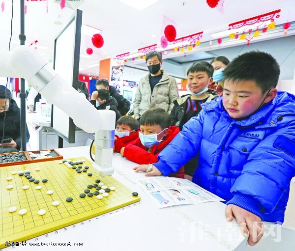 圖三:淮南書(shū)城內(nèi),一位孩子在和機(jī)器人下圍棋。