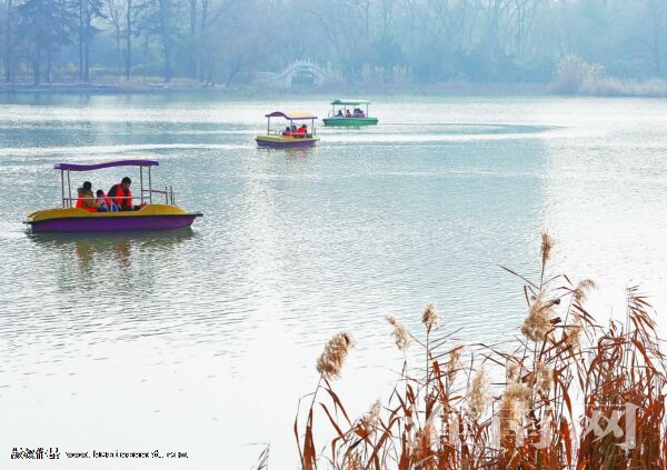 圖二:龍湖公園內(nèi),游客在湖上泛舟。