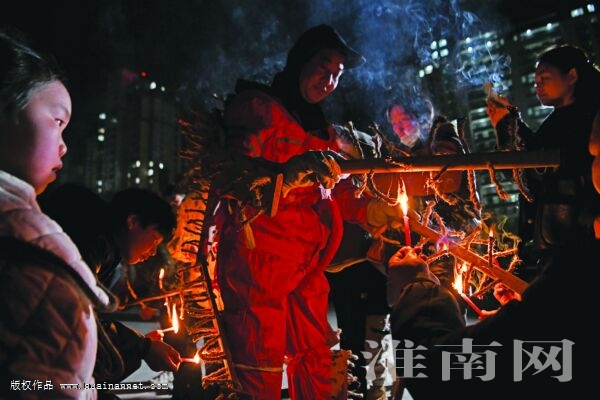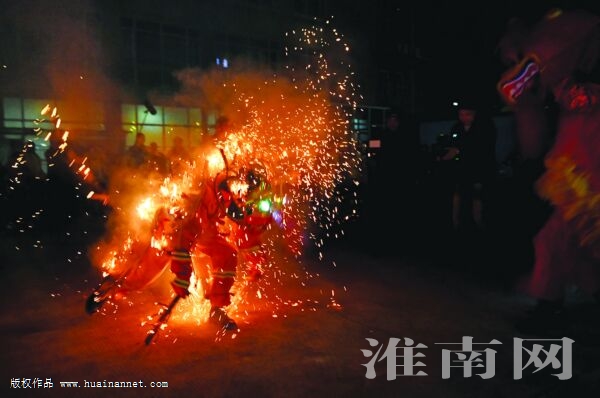春節(jié)臨近,孫元多和他的團(tuán)隊(duì)先后為鳳臺縣城關(guān)鎮(zhèn)淮豐社區(qū)和鳳凰鎮(zhèn)芮集社區(qū)的村民們奉上精彩的“火老虎”表演!盎鹄匣ⅰ鄙蠄霰硌萸,需要點(diǎn)燃身上的麻繩捻子,這樣在表演時(shí)方可形成火星飛濺的藝術(shù)效果。表演角色有老虎和雄、雌獅及幼獅等,整個(gè)表演將虎獅搏斗的激烈場面交織在一起,張弛有度,妙趣橫生。演出時(shí),表演者頭戴防護(hù)帽、身穿防火衣,口咬虎頭籠,身披虎皮,腰扎虎尾、雙手各拿一短棍作虎前爪;每當(dāng)“火老虎”剪尾、抖毛、彈爪或與獅子搏斗時(shí),身上麻繩火星四濺,硝煙彌漫,場面壯觀,扣人心弦,由于表演難度高,道具制作工藝復(fù)雜,這項(xiàng)國家級非遺民間藝術(shù)曾一度瀕臨失傳。近年來,鳳臺縣文化部門搶救性挖掘、保護(hù)、傳承“火老虎”藝術(shù),鼓勵(lì)村級民間藝術(shù)團(tuán)、花鼓燈藝術(shù)學(xué)校等多支隊(duì)伍學(xué)習(xí)傳承,使得近乎失傳的非遺“火老虎”再現(xiàn)淮河畔,豐富沿淮群眾文化生活。(記者 陳 彬 攝)