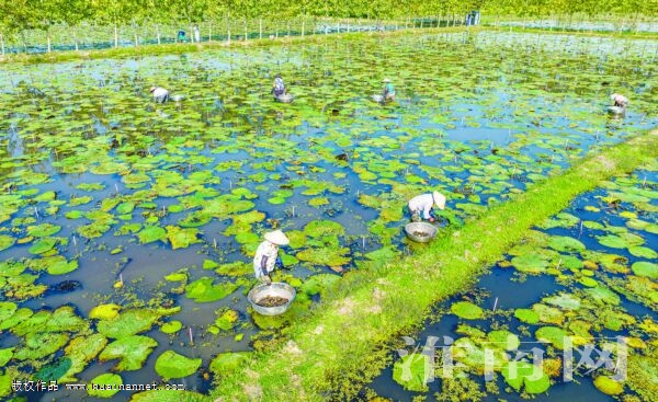 當下正值芡實采摘旺季,迎河鎮(zhèn)綠生灣農(nóng)業(yè)芡實種植基地30多名農(nóng)民組成的水中采摘“小人參”團,每天可采摘1000斤左右,畝均產(chǎn)量350斤、產(chǎn)值6000元,為農(nóng)村經(jīng)濟發(fā)展注入了新活力!。ㄓ浾 倪軍 攝)