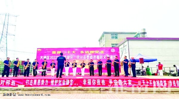 國慶節(jié)前夕,“喜迎二十大 永遠跟黨走”大通區(qū)2022年“迎國慶”文化志愿者進基層文藝演出在上窯鎮(zhèn)方樓村文化廣場舉行。文化志愿者們表演了器樂合奏、獨唱、戲曲、舞蹈等精彩文藝節(jié)目,豐富了群眾的精神文化生活;顒蝇F(xiàn)場,還準備了“掃黑除惡”有獎問答環(huán)節(jié),提升了群眾參與的熱情。(記者 朱慶磊 通訊員 李晧雯 攝)