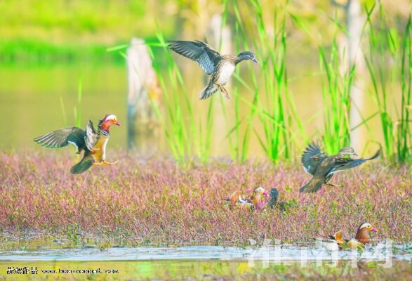 12月初,成群的鴛鴦在濕地公園的鴛鴦湖里結(jié)伴飛行,成為冬日的一道亮麗風(fēng)景線。經(jīng)過綜合治理和環(huán)境修復(fù),曾經(jīng)的采煤沉陷區(qū)變身鴛鴦湖,上百只鴛鴦從遙遠(yuǎn)的北方長(zhǎng)途跋涉來到這里越冬。(通訊員 田剛 攝)