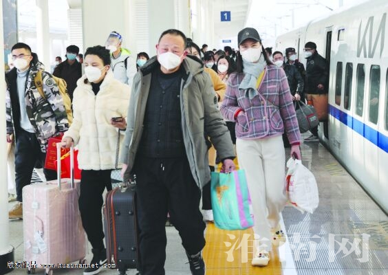 1月17日,農(nóng)歷臘月二十六,淮南各大火車站迎來了節(jié)前春運(yùn)客流高峰。圖為在淮南南站,當(dāng)日中午由上海開來的G7268列車,抵達(dá)我市的出站旅客約1200余人。(記者 張?jiān)?攝)