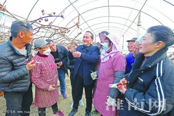 壽縣農(nóng)業(yè)科技特派員王永祿(中)在保義鎮(zhèn)金祠村為農(nóng)戶講解大棚葡萄修枝管理技術(shù)。眼下正值春耕春管關(guān)鍵時(shí)期,壽縣組織百名科技特派員深入田間地頭,指導(dǎo)農(nóng)戶科學(xué)種植、科學(xué)管理,確保實(shí)現(xiàn)增產(chǎn)增收。(記者 倪 軍 攝)