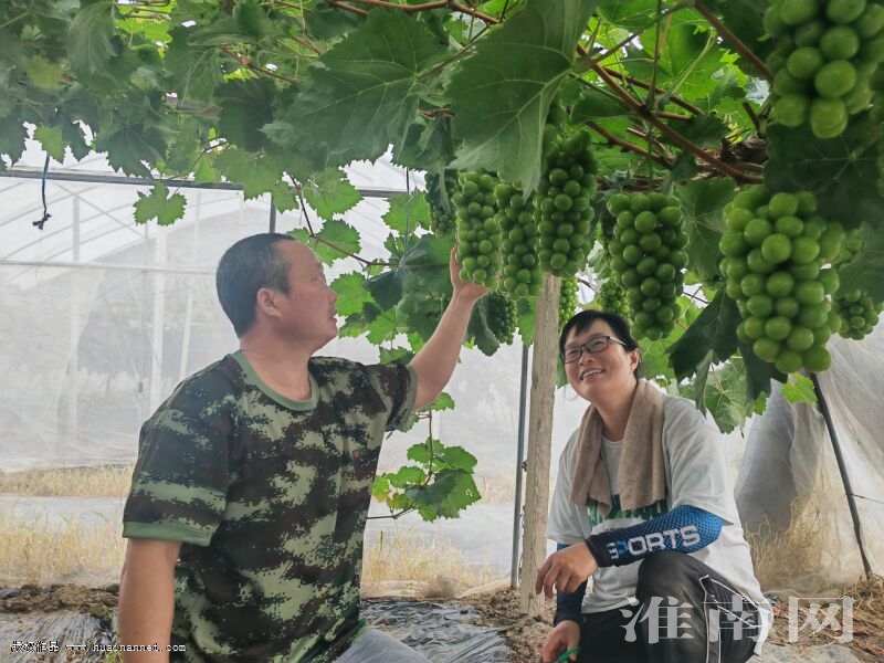 7月12日,在位于鳳臺縣丁集鎮(zhèn)張巷村果兒多家庭農(nóng)場內(nèi),創(chuàng)業(yè)大學(xué)生楊榮群(右)和村民正在為葡萄園安裝遮陽網(wǎng),并檢查葡萄的長勢。