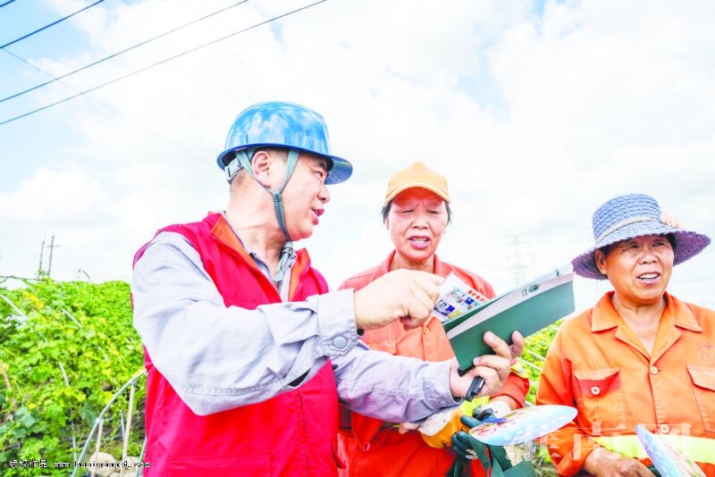 7月27日,國網(wǎng)淮南供電公司員工在大通區(qū)洛河鎮(zhèn)開展防臺風(fēng)特巡,幫助種植戶緊固大棚,并向附近農(nóng)戶宣傳電力設(shè)施保護(hù)知識。(記者 周瑩瑩 通訊員 王明松 攝)