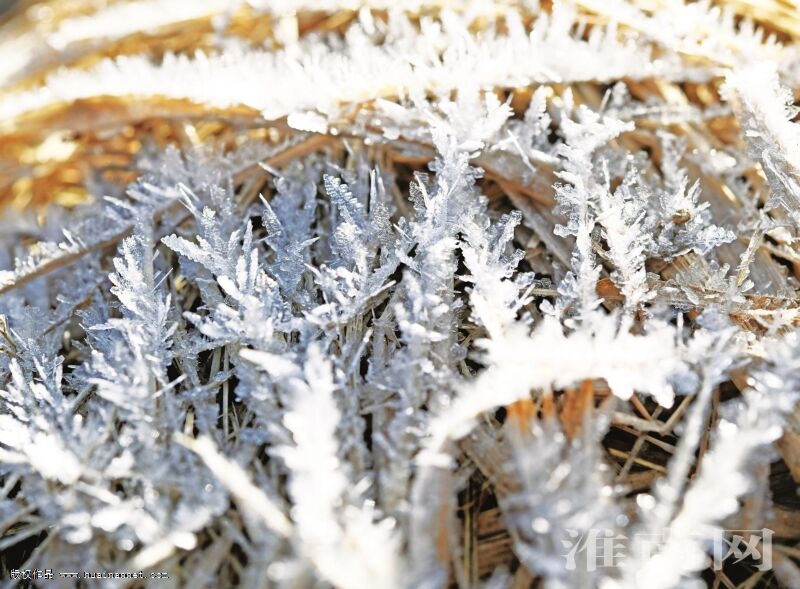 圖三:稻草秸稈表面凝結(jié)冰花晶瑩剔透。(記者 陳彬 攝)