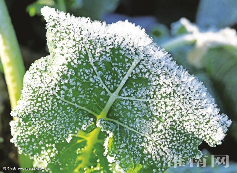 圖一:壽縣堰口鎮(zhèn)江黃村農(nóng)田里,油菜葉表面凝結(jié)一層冰花。