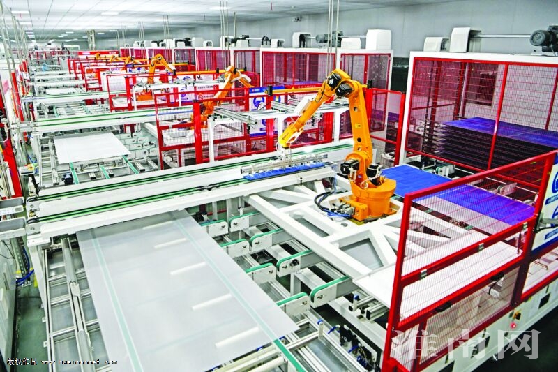 近日,國(guó)晟(鳳臺(tái))異質(zhì)結(jié)雙碳產(chǎn)業(yè)園內(nèi),安徽乾景宇辰新能源有限公司的機(jī)械臂在生產(chǎn)光伏組件。近年來,我市搶抓新能源賽道,集聚光伏、新型儲(chǔ)能等產(chǎn)業(yè)鏈企業(yè)120家,加快產(chǎn)業(yè)轉(zhuǎn)型升級(jí)。(記者 陳 彬 攝)