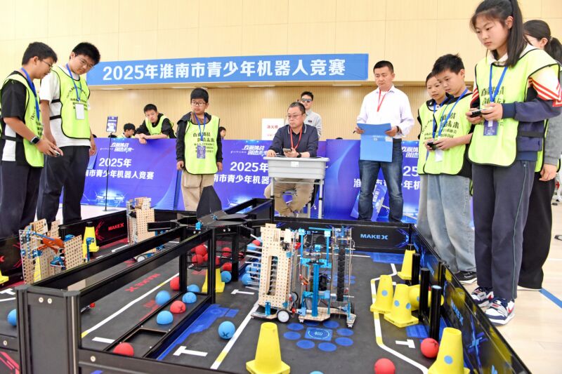 日前,由市科學(xué)技術(shù)協(xié)會、市教育體育局、淮南高新區(qū)共同主辦的2025年淮南市青少年機(jī)器人競賽在北京師范大學(xué)淮南實(shí)驗學(xué)校舉行,來自全市各中小學(xué)校的142支隊伍、270名選手參加了9個項目的競賽。活動旨在推動中小學(xué)機(jī)器人教育發(fā)展,培養(yǎng)青少年創(chuàng)新精神和實(shí)踐能力。圖為參賽選手在進(jìn)行激烈比拼。