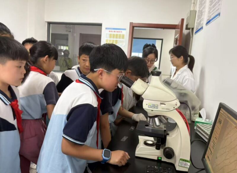 在專業(yè)技術(shù)人員的指導下,師生們參與了六個實驗研學項目:顯微鏡觀察洋蔥鱗葉表皮細胞、維生素C與高錳酸鉀的氧化還原反應(yīng)、不溶性微粒檢測實驗、蔬菜中有機磷農(nóng)藥殘留的提取演示、微生物菌落的平板培養(yǎng)展示,以及“淮南市新時代文明實踐基地——藥用植物園”實地參觀研學。