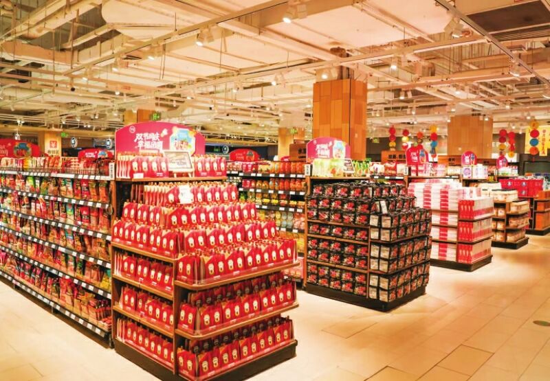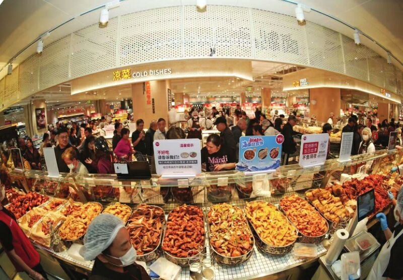 在商品供給上,門(mén)店全方位升級(jí)。生鮮區(qū)引入蕓嶺有機(jī)蔬菜、永輝定向種植的貝貝南瓜,以及應(yīng)季的小青檸檬、大荔冬棗等;肉禽海產(chǎn)區(qū)匯聚農(nóng)夫好牛牛腩塊、無(wú)抗雞、澳洲進(jìn)口牛肉,還有梭子蟹、皮皮蝦等時(shí)令海味直送門(mén)店;熟食區(qū)融合全國(guó)風(fēng)味與本地特色,既有椒鹽皮皮蝦、撈汁小海鮮,也有蕪湖紅皮鴨、鹵鵝;烘焙區(qū)的榴蓮千層等高顏值產(chǎn)品備受青睞;食百類(lèi)則提升進(jìn)口商品占比,設(shè)立魔童專(zhuān)區(qū),還引入近60支胖東來(lái)自有品牌商品及130余支永輝自有品牌商品。