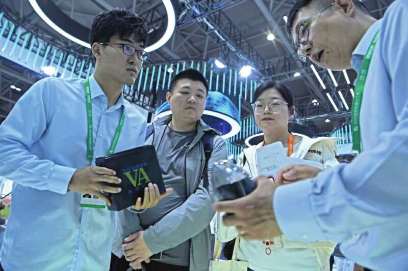 圖一:2025世界制造業(yè)大會(huì)現(xiàn)場,觀眾了解淮南益恒科技有限公司展出的電池產(chǎn)品。