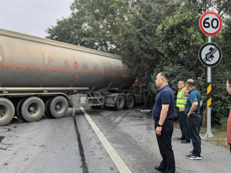 當天,市交通公路部門值班人員巡查至該路段時,發(fā)現(xiàn)大量車輛停滯。帶班領導立即帶隊跑步上前查看,發(fā)現(xiàn)一輛長約17米的魯M牌照的氣罐半掛車橫跨半幅車道,車頭緊抵行道樹和路燈桿,擋風玻璃碎裂,萬幸駕駛員未受傷。市交通公路部門工作人員第一時間撥打了122報警電話,并迅速啟動應急響應。