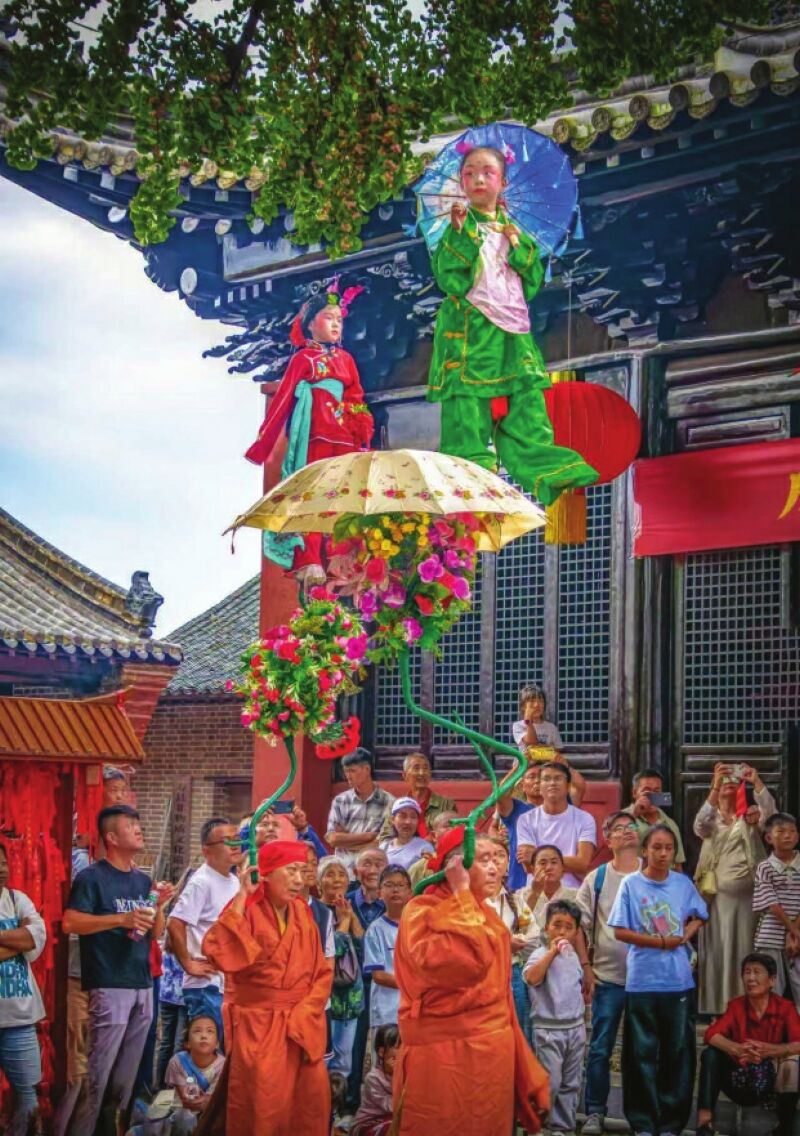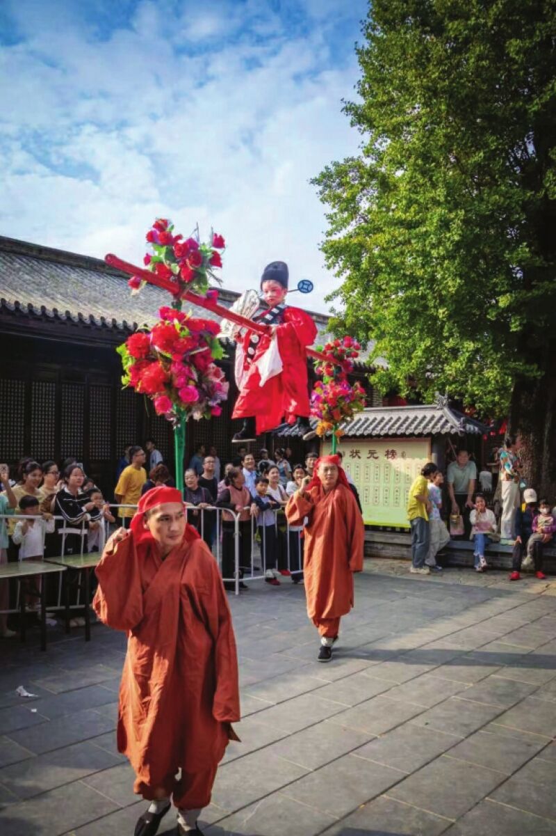 現(xiàn)場,抬閣與肘閣輪番亮相。肘閣上,小演員扮成傳統(tǒng)戲劇人物,在成人頂托的鐵架上輕搖慢擺,盡顯“空中芭蕾”之美;抬閣則由多人抬行,各色人物造型傳遞祈福寓意,被譽為“肩膀上的戲臺”。