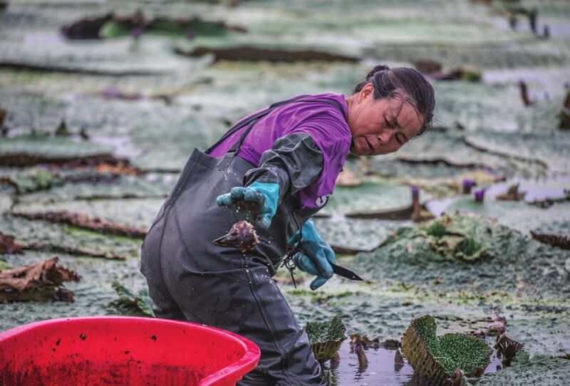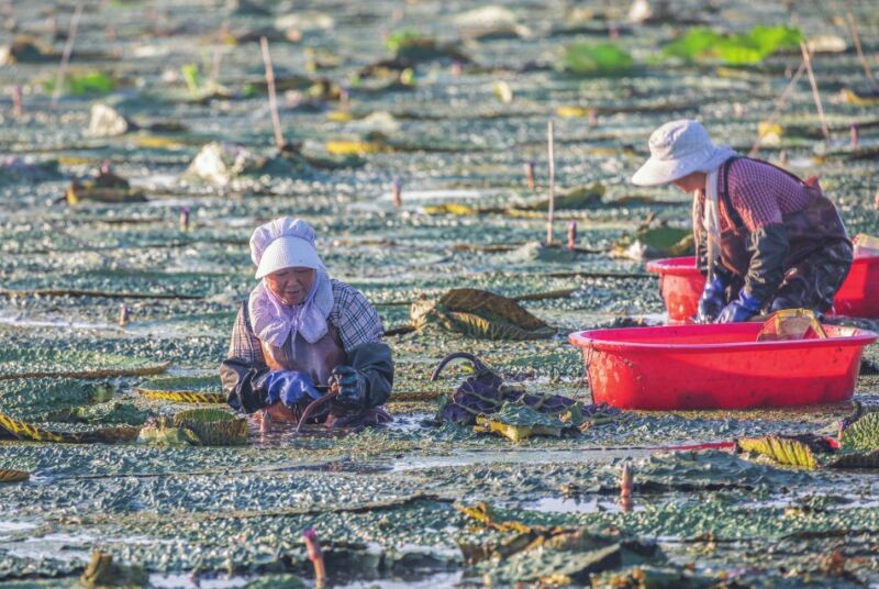 金秋時(shí)節(jié),大通區(qū)王樓村的百畝芡實(shí)迎來(lái)采收季。村民們彎腰俯身,熟練地采摘著渾圓飽滿(mǎn)的芡實(shí)果實(shí),水面映著忙碌的身影,一派豐收景象。