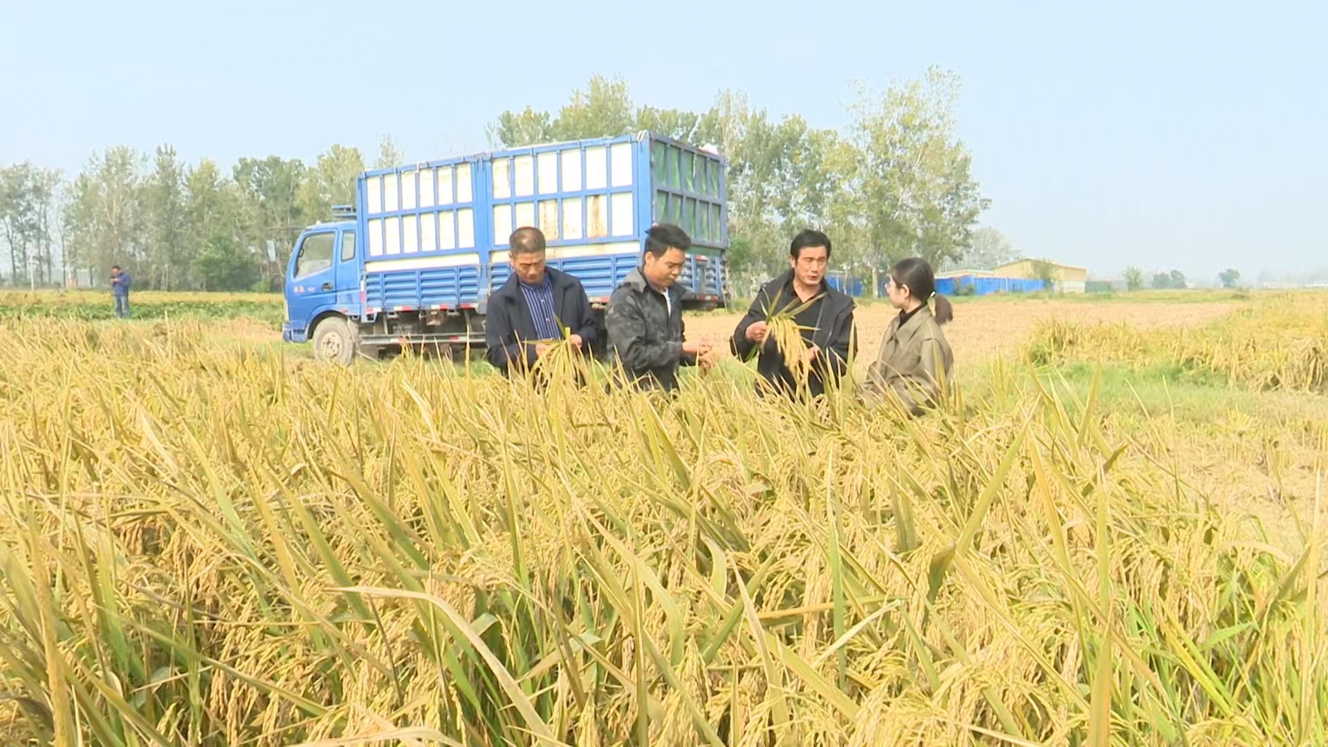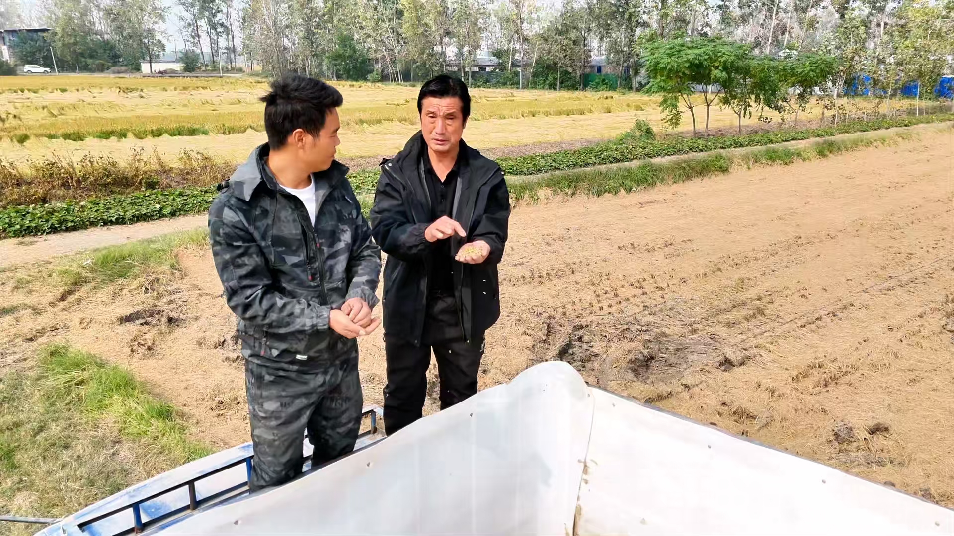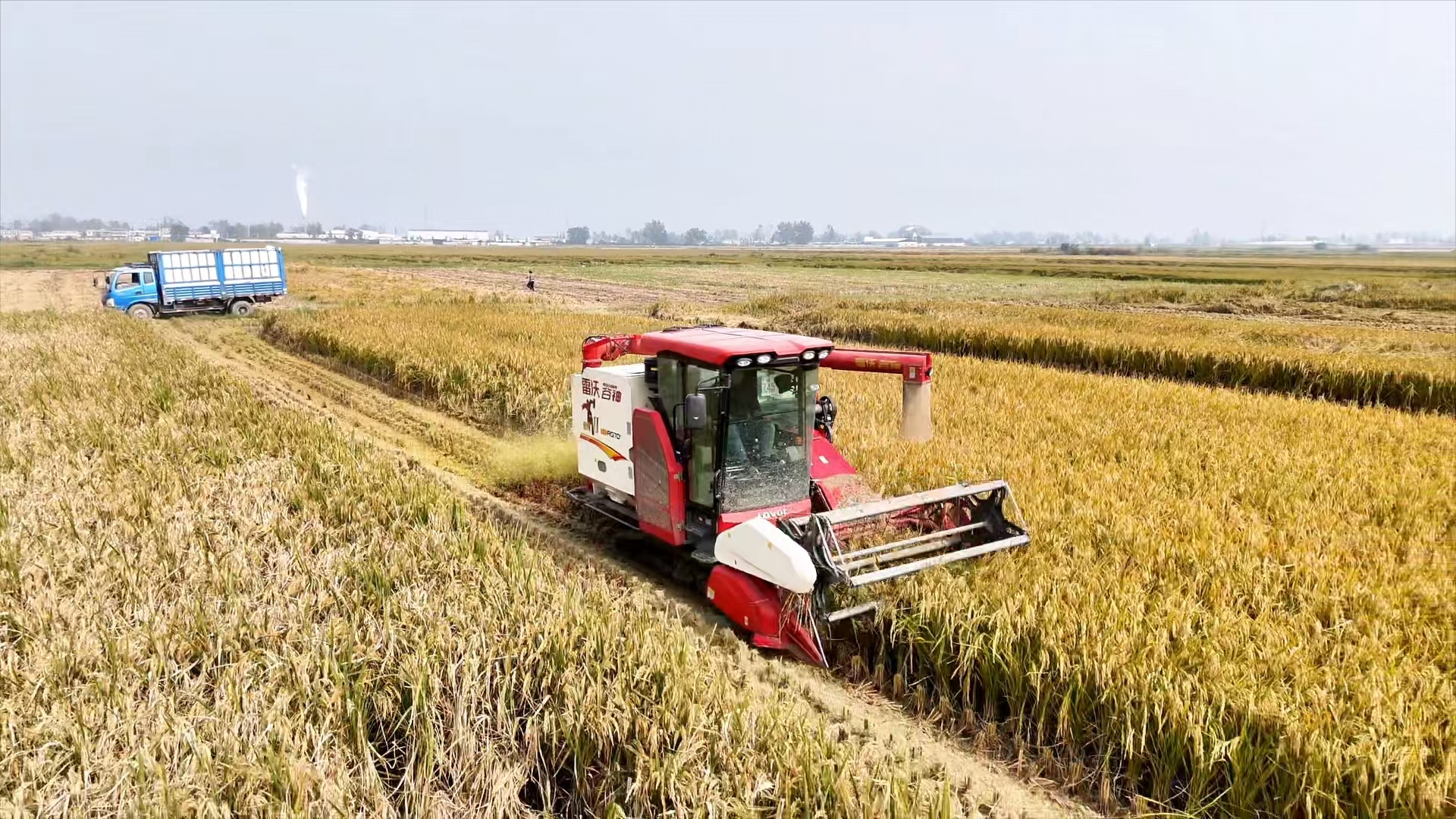 在合作社托管的一片金色稻田里,記者看到,現(xiàn)場機聲隆隆,一輛輛收割機來回穿梭,呈現(xiàn)一派繁忙的秋收場景。停在田邊的運糧車待裝滿后,將稻谷運往合作社倉庫進行烘干。