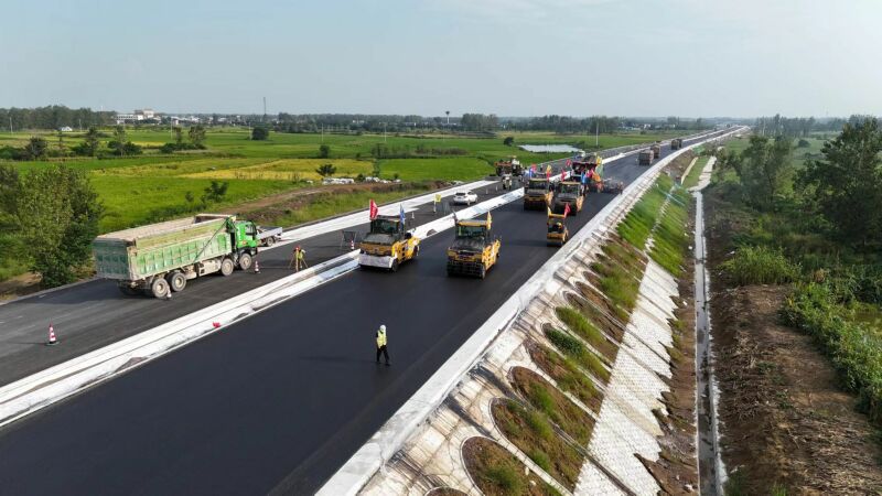 受汛期強降雨影響,項目建設(shè)工期壓力巨大。為此,項目部提前設(shè)置臨時排水溝、布置集水井等針對性措施,確保防雨篷布等物資就近儲備,建立氣象預(yù)警聯(lián)動機制,保障施工質(zhì)量和作業(yè)連續(xù)性。同時,搶抓晴好天氣“窗口期”,先后投入全斷面瀝青攤鋪機、雙鋼輪壓路機及膠輪壓路機等大型作業(yè)設(shè)備10余臺套協(xié)同作業(yè),配備作業(yè)工人120余名,創(chuàng)造單日瀝青攤鋪里程突破3千米的“淮桐速度”。