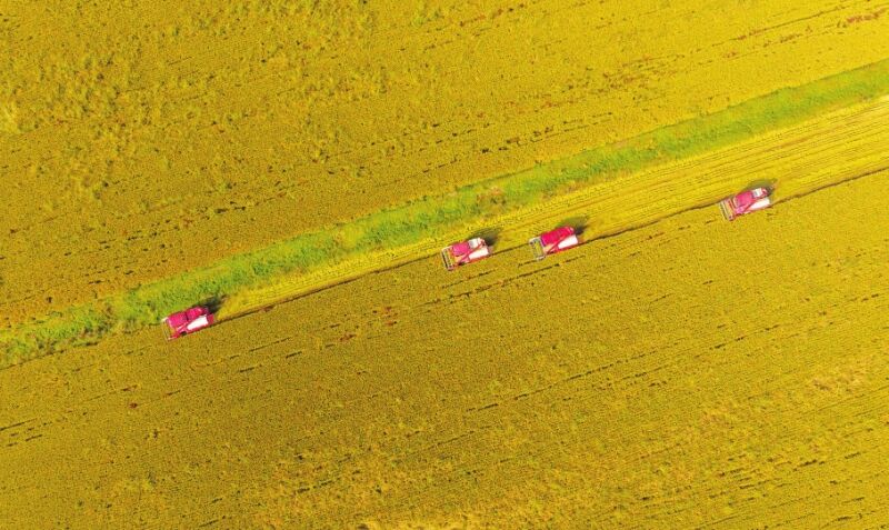 11月2日,金色的陽光灑滿田野,淮南農(nóng)場迎來豐收的喜悅,連片的稻田翻涌著金色的波浪,沉甸甸的稻穗壓彎了枝頭,收割機在田間來回穿梭,將金燦燦的稻谷盡數(shù)歸倉,奏響金秋時節(jié)里最動聽的豐收交響曲。
