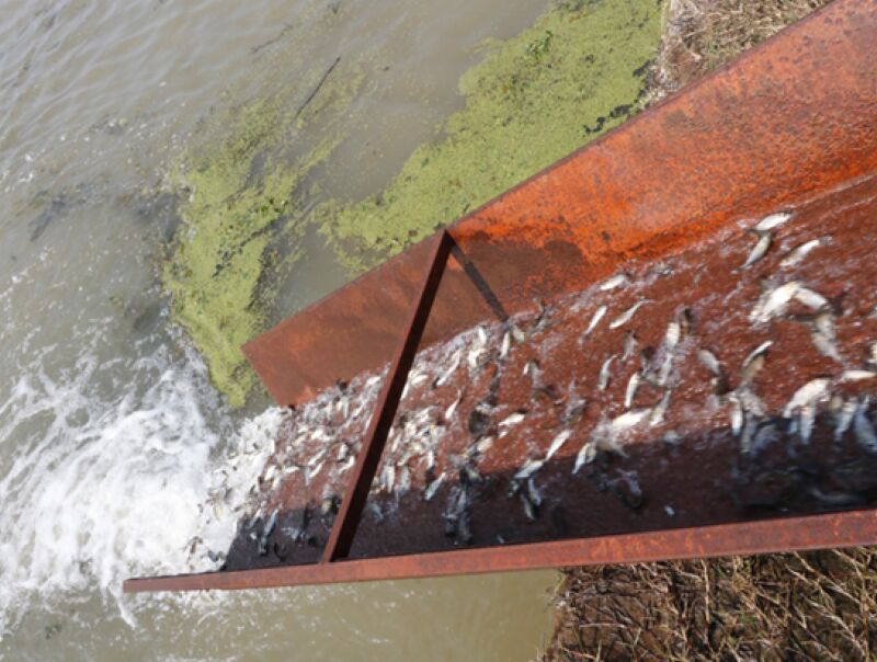 淮南從2008年開始在淮河水域開展增殖放流,經(jīng)多年放流,如今放流作業(yè)已十分專業(yè)且迅捷。除放流展示環(huán)節(jié)外,其余放流行動(dòng)則是將魚苗運(yùn)輸專用車盡量靠近河邊,然后將車上連接出口的管袋通過鐵制水槽接入河中。隨著閘閥的開啟,水流沖出,魚兒沿著槽道躍入河水之中。這種方式既保護(hù)魚苗,確保成活率,又提升了放流效率。