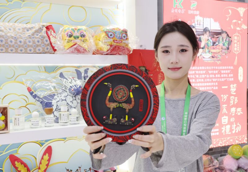 11月5日,第八屆中國國際進口博覽會在上海開幕。我市11家企業(yè)攜特色產(chǎn)品集中亮相國家會展中心(上海)“安徽淮南”展館,讓中外觀眾領(lǐng)略淮南老字號、非遺代表作和地理標志產(chǎn)品的獨特魅力。圖為工作人員在壽州香草展臺展示一款極具楚風(fēng)漢韻的文創(chuàng)產(chǎn)品。