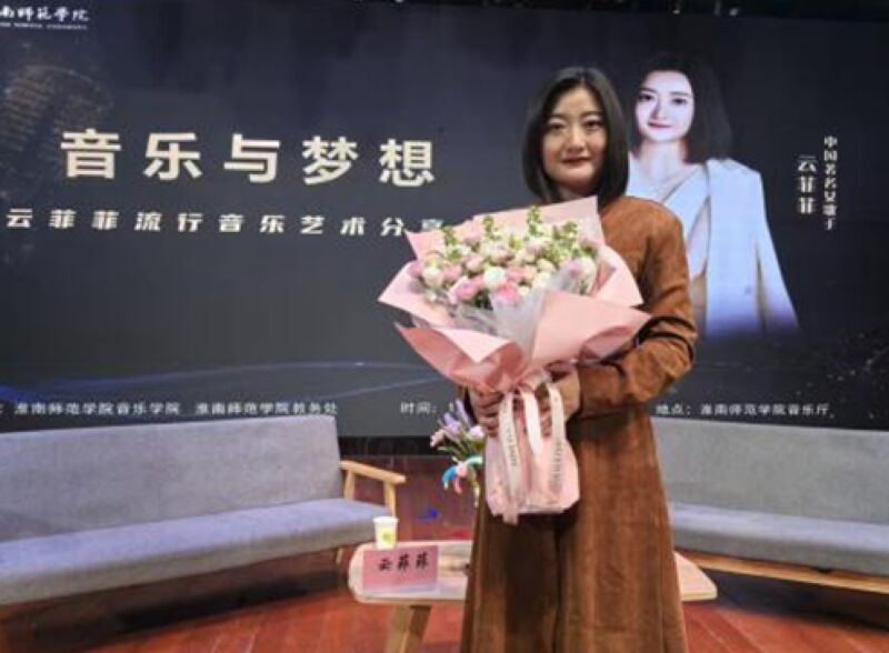 鎂光燈下,一襲棕色連衣裙的云菲菲微笑著望向臺下那些年輕而熱切的眼睛。11月5日在淮南師范學(xué)院音樂廳,近400名大學(xué)生與云菲菲共度了一場看似演唱會(huì)、實(shí)則遠(yuǎn)不止于此的分享會(huì)。這不是一場普通的演唱會(huì),而是一次靈魂的返鄉(xiāng)——一位從淮河岸邊走向全國的歌者,帶著她的音樂與夢想,回到了滋養(yǎng)她的土地。