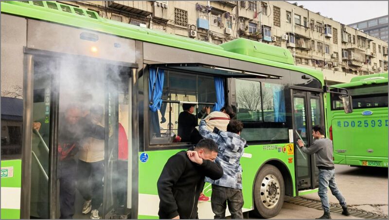 理論培訓(xùn)結(jié)束,緊張有序的逃生演練隨即啟動。實操演練模擬了一輛公交車起火的場景,“嗚——”一陣急促的警報聲劃破現(xiàn)場,演練總指揮蔡軍模擬司機發(fā)出指令:“大家保持冷靜!車輛已斷電,我正在打開車門和應(yīng)急開關(guān)!”瞬間,模擬車廂中部“嘭”的一聲悶響,橘紅色“火光”竄起,刺鼻“濃煙”快速彌漫,十幾名“乘客”中有人驚呼、有人本能起身,駕駛員立即通過擴音器喊話:“恐慌比火勢更致命!用衣物捂好口鼻,低姿待命!”