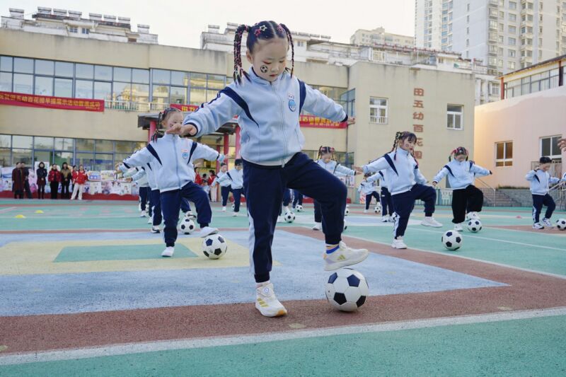 今年我市各類足球聯(lián)賽如火如荼,田五幼百花園作為全國首批足球特色幼兒園,響應(yīng)足球運(yùn)動(dòng)“從娃娃抓起、從基層抓起、從基礎(chǔ)抓起”號(hào)召,積極引進(jìn)足球教育。相關(guān)培育有助于孩子們強(qiáng)健體魄,提升他們對(duì)足球運(yùn)動(dòng)的興趣,為我市足球運(yùn)動(dòng)發(fā)展儲(chǔ)備人才。圖為11月11日下午,田五幼百花園的小朋友展示足球運(yùn)動(dòng)訓(xùn)練成果。