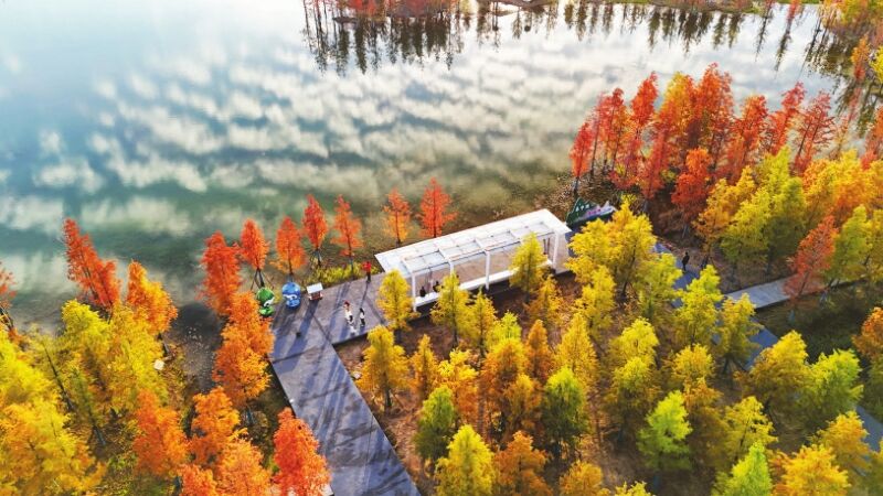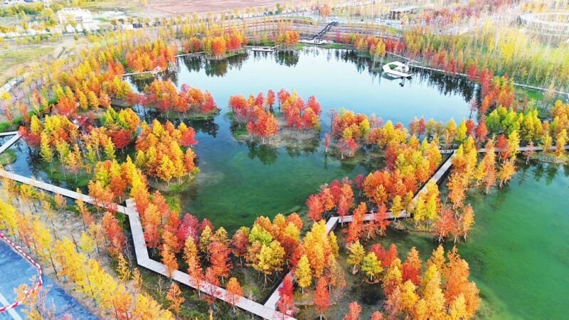 立冬時節(jié),淮南春申湖公園內(nèi)水杉、烏桕等植物五彩斑斕,色彩旖旎,構(gòu)成一幅精美的“油畫”。