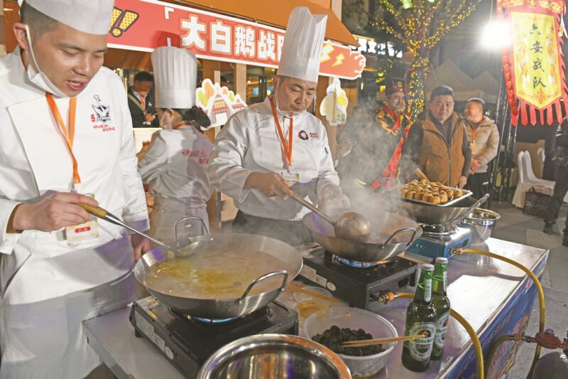 淮南主會(huì)場(chǎng)現(xiàn)場(chǎng),參賽廚師加工特色美食。