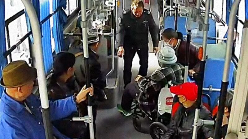 “你在這別動,我來把車搞好!蓖鯉煾狄贿叞矒嶂髬專贿呴_始操作公交車上的無障礙設施。期間,大媽連連道謝:“太謝謝師傅了!我這真是麻煩你了!