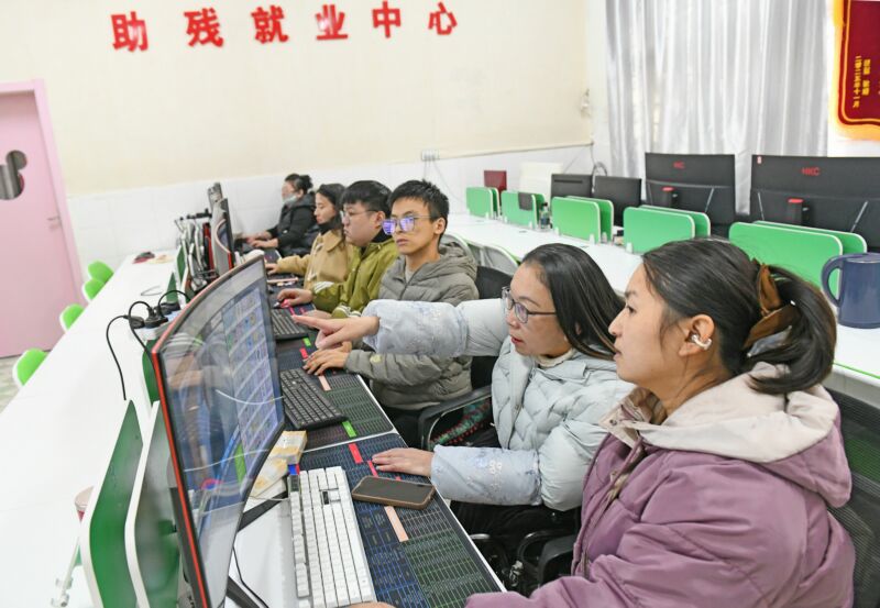 12月3日是第三十四個國際殘疾人日。近年來,我市出臺多項政策扶持殘疾人就業(yè)創(chuàng)業(yè)。圖為大通區(qū)創(chuàng)業(yè)孵化及技能人才培養(yǎng)基地,身殘志堅的李傳琴(右二)吸納殘疾人從事自動無人售賣機后臺審核工作。