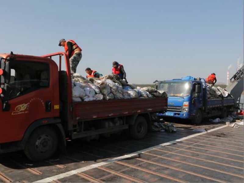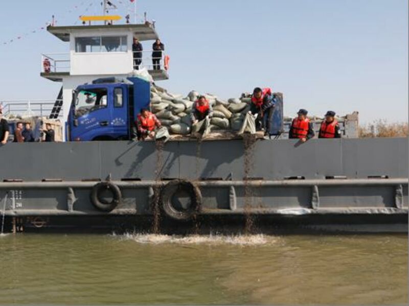 此次人工增殖放流活動(dòng)為淮南港3號(hào)水上綜合服務(wù)區(qū)項(xiàng)目所開展的生態(tài)補(bǔ)償,活動(dòng)地點(diǎn)位于平圩淮河大橋上游的原連崗碼頭處,該水域?qū)儆诨赐豸~保護(hù)區(qū)實(shí)驗(yàn)區(qū)。為確保安全,此次人工增殖放流活動(dòng)租用了大型渡運(yùn)船。因底棲生物貨源不同,渡運(yùn)船先后從淮河北岸及南岸載運(yùn)裝有底棲生物的貨運(yùn)車,共計(jì)7輛,在船上安置穩(wěn)妥。