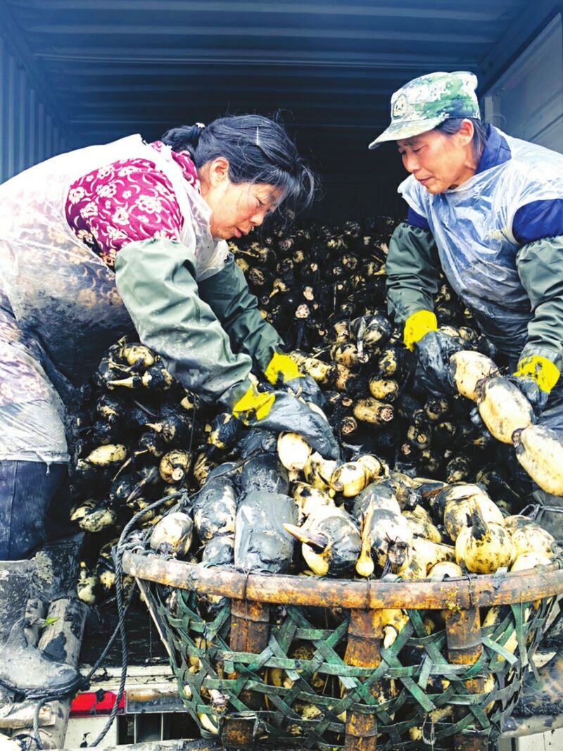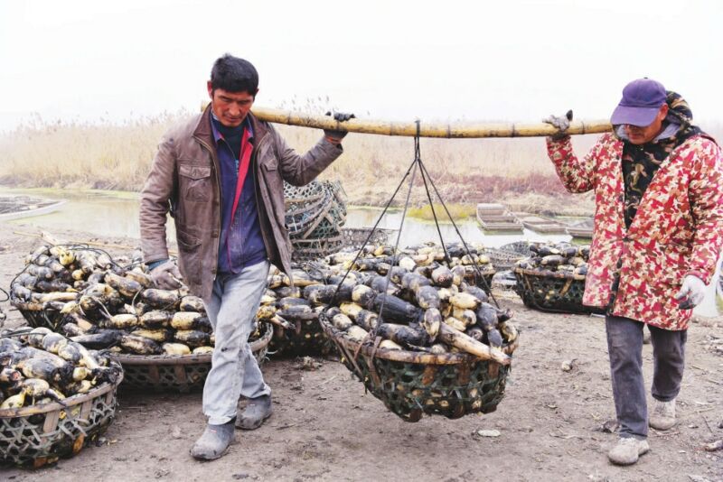 田家庵區(qū)十澗湖畔千畝蓮塘褪去夏日的碧綠,殘荷葉梗低垂。采藕人身著膠褲,彎腰在泥水中摸索,雙手順著荷梗探入淤泥,熟練地拔出肥白的蓮藕。新挖的蓮藕帶著泥水,一筐又一筐在塘邊堆成小山?諝庵酗h散著泥土的清香,藕農(nóng)們臉上更是洋溢著豐收的喜悅。