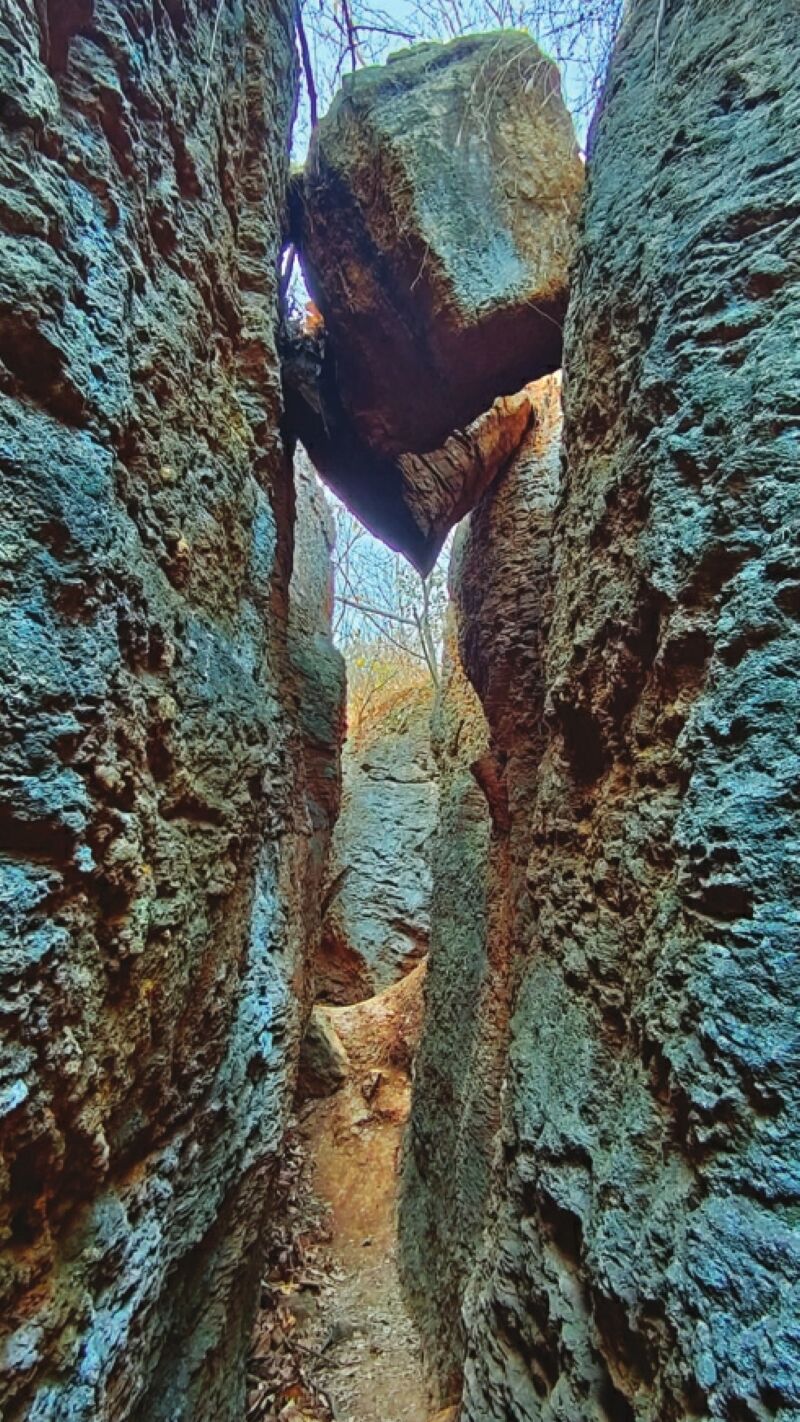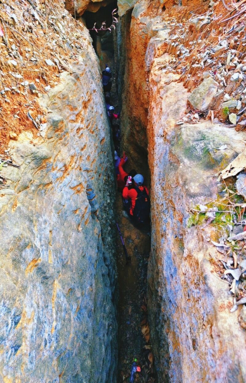 八公山是風光旖旎的歷史文化名山,層巒疊嶂,雄奇靈秀。其南側裂谷是一處獨特的地質景觀,數條幽深裂谷并列,最長的約三十米。如今,這里已成為吸引眾多游客與戶外愛好者的探秘之地,人們穿梭其間,隔谷相呼,樂趣無窮。