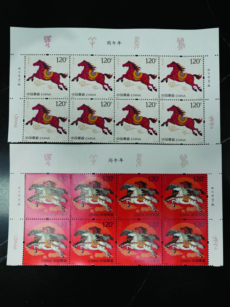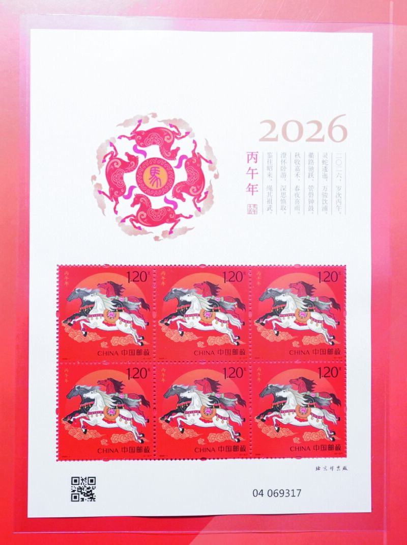 本次發(fā)行的《丙午年》馬年生肖郵票是中國郵政第四輪十二生肖郵票系列的收官之作,它一套兩枚,面值均為1.20元。第一枚名為“馳躍宏圖”,以“騰躍新時代”為核心意象,展現(xiàn)了一匹紅馬奔馳于祥云之上,鬃毛如焰,四蹄生風。第二枚名為“萬駿臻福”,以三匹奔跑的駿馬詮釋“萬馬奔騰、共同奮進”的意象。