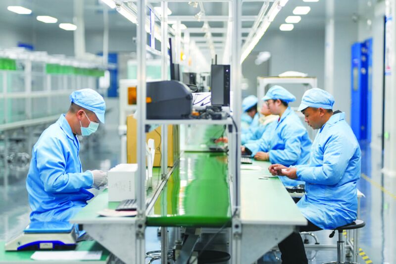 日前,全球首條靜脈識(shí)別模組專業(yè)產(chǎn)線——圣點(diǎn)科技淮南智能制造產(chǎn)線在田家庵區(qū)正式投產(chǎn),為靜脈識(shí)別技術(shù)從“小眾應(yīng)用”邁向“市場(chǎng)普遍適用”提供了堅(jiān)實(shí)的產(chǎn)能基石,也為我市搶占新一代信息技術(shù)制高點(diǎn)、培育新質(zhì)生產(chǎn)力注入了強(qiáng)勁動(dòng)能。該產(chǎn)線隸屬“圣點(diǎn)科技靜脈生物識(shí)別設(shè)備制造項(xiàng)目”,一期達(dá)產(chǎn)后,預(yù)計(jì)可實(shí)現(xiàn)年產(chǎn)靜脈生物識(shí)別設(shè)備200萬(wàn)套,年產(chǎn)值約2.5億元,年稅收約500萬(wàn)元。圖為生產(chǎn)線上的工人正在進(jìn)行生產(chǎn)作業(yè)。
