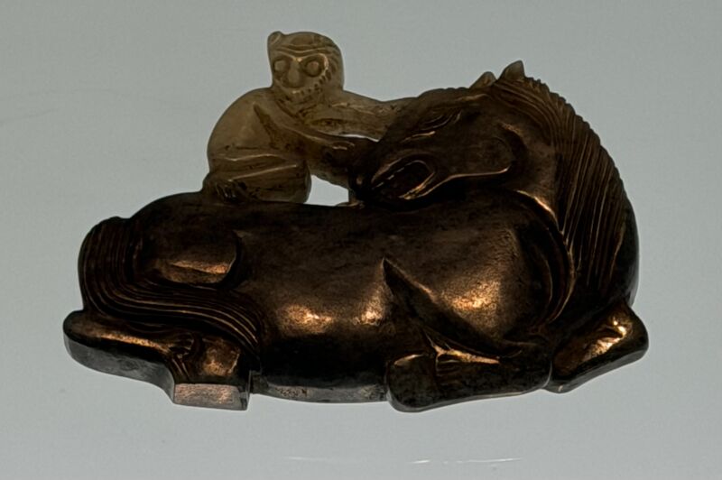 館內(nèi)另一件明代“馬上蹬侯”玉帶鉤,便充滿了巧思與諧趣。我們看到一匹溫順的小馬背上,蹲坐著一只靈動(dòng)活潑的猴子,造型栩栩如生!昂铩迸c“侯”諧音,這一組合寄托了“馬上登侯”(馬上封侯)的吉祥寓意——正如人們將“福”字倒貼,以祈“福到”一般。在這里,馬的形象成為古人實(shí)現(xiàn)人生抱負(fù)、奔赴世俗理想的完美載體與寄托,足見其吉祥寓意之深入人心。