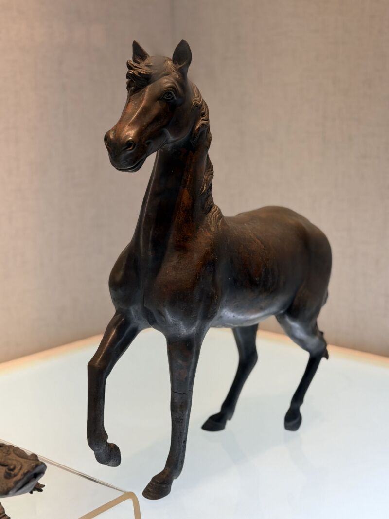 1月13日,跟隨講解員黃鳴玥的指引,我們步入市博物館“淮土遺珍”展廳。在溫潤的燈光下,一尊清代紅銅馬雕塑靜立臺面。它以精煉紅銅塑成,通體呈現(xiàn)深邃而溫潤的棗紅色,歷經(jīng)時(shí)光摩挲,光澤內(nèi)斂厚重。細(xì)觀其態(tài):馬首昂揚(yáng),目光炯炯前視,雙耳警覺豎立;頸部線條圓融豐滿,身軀壯碩雄健,充盈著蓬勃的生命力。它右前足高揚(yáng),左后足似將離地而未離,三足穩(wěn)健著地,恰似行進(jìn)中驀然提速、闊步向前。尤為生動(dòng)的是,匠人巧妙刻畫了奔馳之瞬間——馬鬃與馬尾的毛發(fā)皆被疾風(fēng)吹拂向前,仿佛能聽見呼嘯之風(fēng)與奔騰之音。整體造型在力量感的蓄勢與行進(jìn)間的動(dòng)感中取得精妙平衡,威武昂揚(yáng)而又氣定神閑,將馬的遒勁之力與靈動(dòng)之姿凝聚于永恒。
