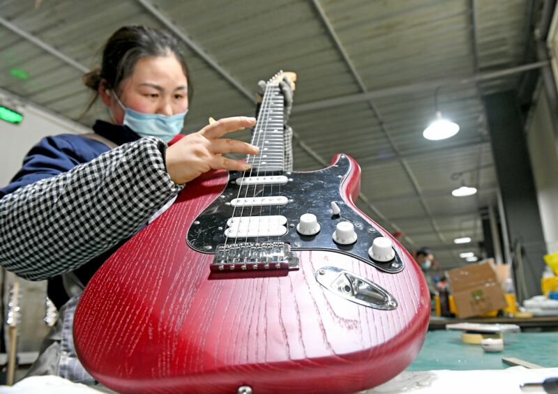 開(kāi)年以來(lái),作為連續(xù)六次入選國(guó)家文化出口重點(diǎn)企業(yè),淮南市樂(lè)森黑馬樂(lè)器有限公司通過(guò)生產(chǎn)線技改,數(shù)控設(shè)備升級(jí),開(kāi)足馬力,抓好海外訂單生產(chǎn)。圖為近日,該公司工人正在生產(chǎn)電吉他、電貝司等樂(lè)器。