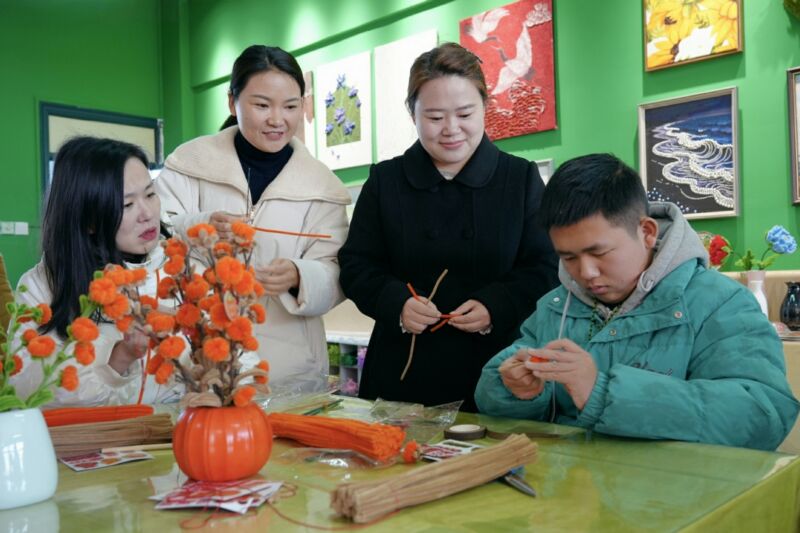 1月22日上午,市教育體育局聯(lián)合市委社工部、團市委、市青年企業(yè)家協(xié)會,在淮南市特殊教育學(xué)校開展“新春暖童心·相伴護成長”關(guān)愛特殊少年兒童志愿活動。該項活動是“甘甘為淮·暖冬行動”的重要一環(huán),參與單位現(xiàn)場贈送愛心物品近300件套。志愿者與特殊少年兒童親切互動,用愛繪就冬日溫暖圖景。圖為志愿者與市特殊教育學(xué)校學(xué)生親切互動制作手工作品。