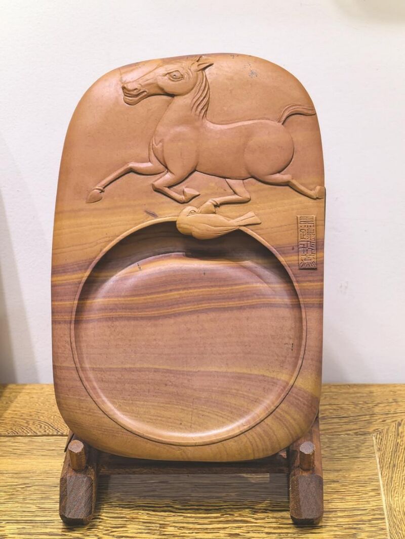 一方硯臺(tái)的誕生,始于與石材的對(duì)話。沈楊楊精心挑選了一塊色澤沉穩(wěn)、紫中透輝的紫金石料,巧妙依據(jù)石料天然的色帶與肌理進(jìn)行布局。硯臺(tái)上方,奔馬身軀健碩,四蹄騰空,脖頸高昂,充滿向前沖擊的力量感;下方的飛燕回首驚望,翅翼舒展;最下方,圓潤(rùn)飽滿的硯堂猶如一輪明月靜臥,墨池微凹,仿佛可涵養(yǎng)萬(wàn)千清輝。三者自上而下,形成“駿馬—飛燕—圓月”的垂直意境空間,動(dòng)感與靜謐、傳統(tǒng)寓意與實(shí)用功能在此和諧相融。
