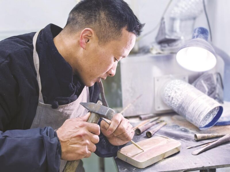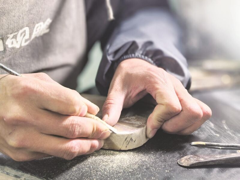 在雕刻技法上,他以浮雕為主,并融入圓雕的刻畫理念!耙谟邢薜耐蛊鹂臻g里,表現(xiàn)出一匹從各個(gè)角度看都生動(dòng)立體、甚至透著神采的馬,難度很高!彼绕渥⒅貙(duì)馬匹肌肉的起伏、骨骼的轉(zhuǎn)折以及面部神情的細(xì)膩打磨。通過(guò)反復(fù)調(diào)整角度與深淺,使光線掠過(guò)時(shí),馬的形象產(chǎn)生豐富的光影變化,從而在硯面上營(yíng)造出強(qiáng)烈的立體感與韻律感。那匹馬,正面看昂首嘶鳴,側(cè)面觀奔騰如電,從斜面欣賞,嘴角微揚(yáng)的神情又透出幾分憨拙與生氣,這正是沈楊楊匠心獨(dú)運(yùn)之處。