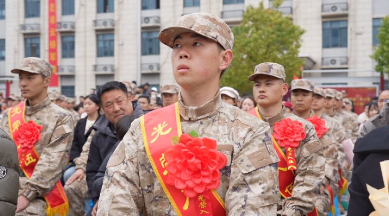鏡頭定格青春面龐,掌聲送別出征兒郎,F(xiàn)場,身著嶄新戎裝、肩披“光榮入伍”綬帶的新兵們精神抖擻、意氣風(fēng)發(fā),眼神里滿是對軍營的向往與對家鄉(xiāng)的眷戀。家長們既自豪又不舍,有的悄然拭淚,有的踮足凝望,只為多看一眼身著軍裝的孩子。