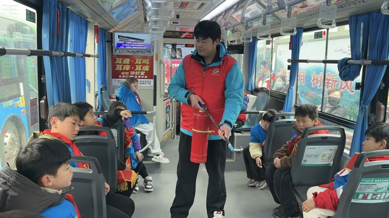 在溫情慰問(wèn)之外,這場(chǎng)活動(dòng)更是一堂生動(dòng)的“安全必修課”。公交三車隊(duì)安管人員身穿紅馬甲,現(xiàn)場(chǎng)開設(shè)“移動(dòng)安全課堂”。他們結(jié)合公交車廂實(shí)際環(huán)境,向小志愿者們細(xì)致講解滅火器使用方法、車廂應(yīng)急逃生路徑及日常安全乘車規(guī)范。