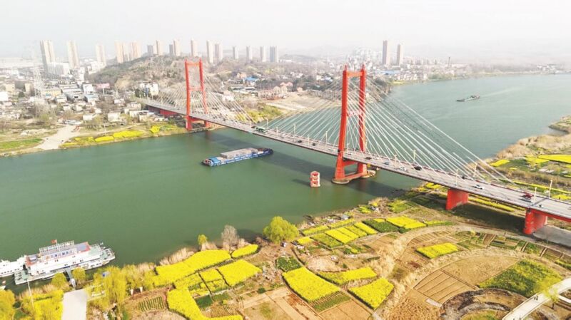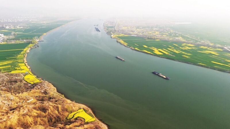 春分時(shí)節(jié),在鳳臺(tái)縣淮河岸邊,油菜花綿延鋪展,春意盎然。水上貨船穿梭,煤炭、建材等物資往來(lái)不息,呈現(xiàn)出一派繁忙的航運(yùn)景象。
