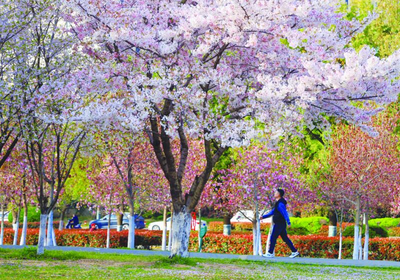 市民在街頭欣賞盛開的海棠花。