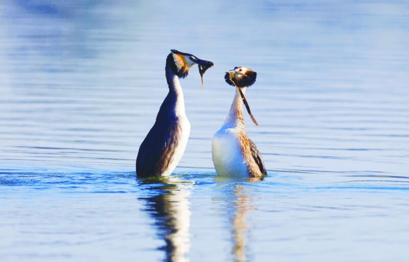 人民公園水塘內(nèi)的鳳頭鸊鷉又到了戀愛季節(jié)。