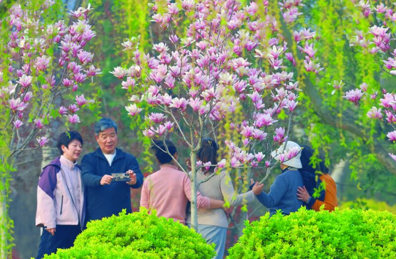 市民在舜耕山玉蘭樹下歡樂留影。