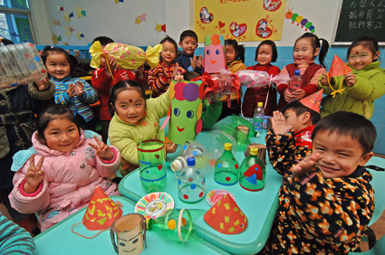 1月6日上午,淮南市田區(qū)第一幼兒園的老師帶領(lǐng)孩子們用廢舊卡紙、手提方便紙帶、廢舊飲料瓶等制成玩具,既培養(yǎng)了孩子們的節(jié)約環(huán)保意識和動手操作、創(chuàng)新實踐能力,又為幼兒園節(jié)約了大量辦園教材。圖為開心的孩子們在展示新制成的玩具。